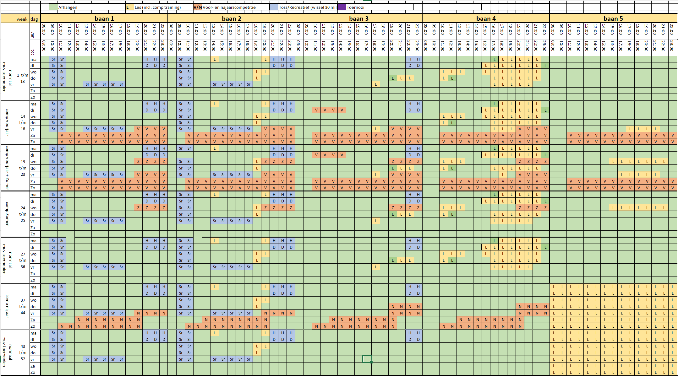 Dit schema voor 2026 is tot maart 2027 geeft aan waar de banen voor beschikbaar worden gesteld. Zijn ze voor dat doel niet nodig, dan zijn ze weer vrij beschikbaar. Competitieverplichtingen en toernooien doorbreken de baanindeling.